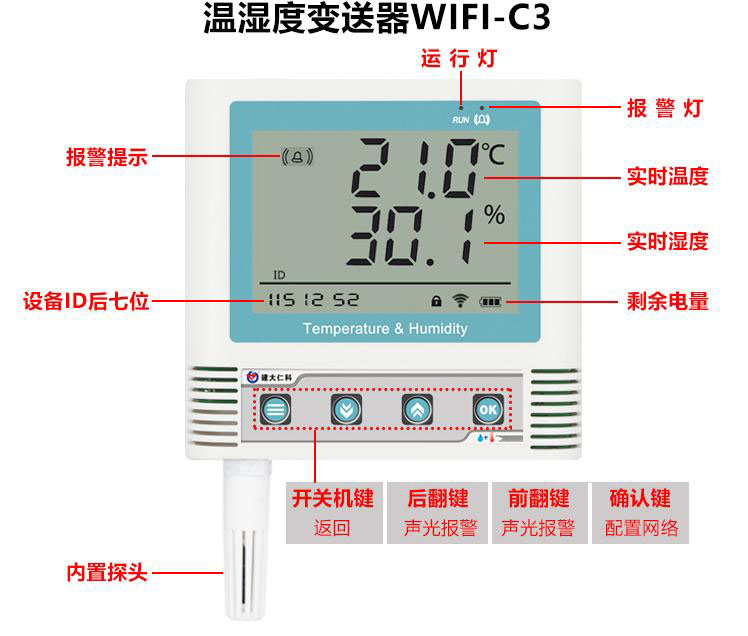 無線C3溫濕度91粉色视频外觀設計有按鈕。粉色影院十八禁不僅可以從微信公眾賬戶設置參數,還可以通過這些按鈕設置設備參數。按下按鈕,可以設置以下內容:修改設備密碼、溫度和濕度的上下報警值、數據上傳的時間間隔、報警聲音的開關、WiFi網絡的配置等。